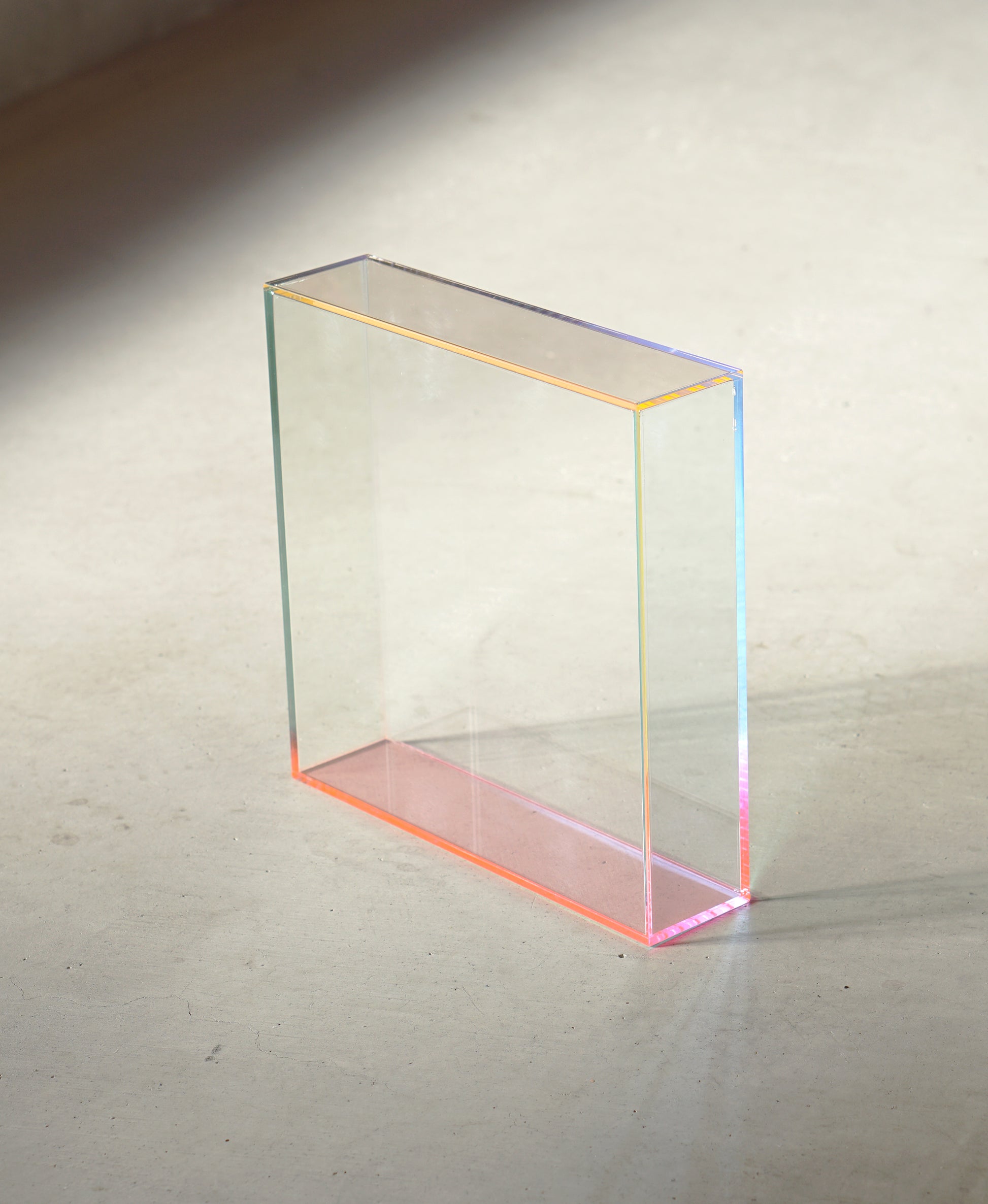 アクリルエッジ板(エッジプレート)で制作したボックス型サイン。表面は透明ですが、断面には鮮やかな色味が浮かび上がる特殊なアクリル板です。透明の両面テープを使用して壁に貼り付けたり、カウンターの上に置いたりとアイデア次第で様々なシーンでご活用いただけます。