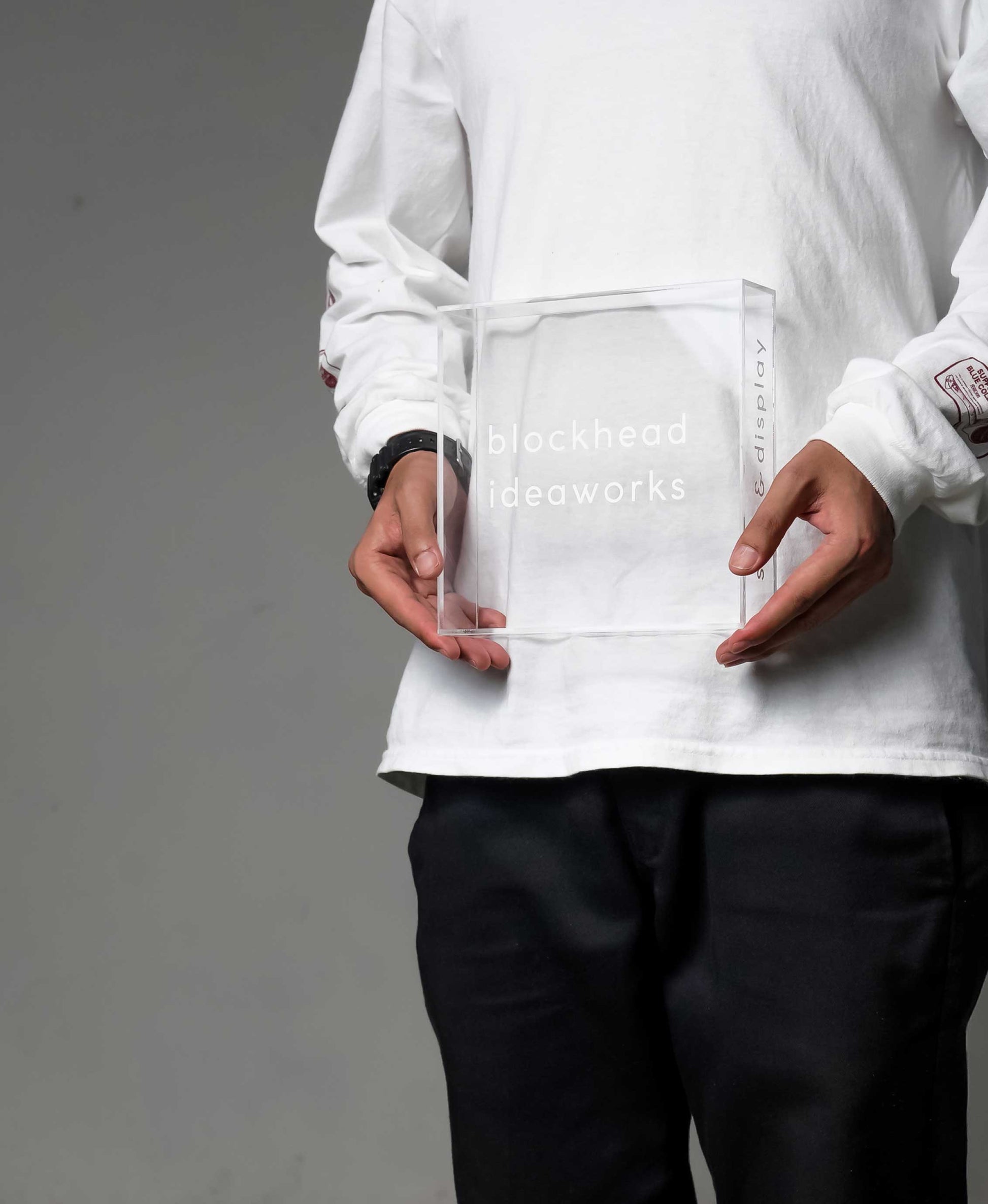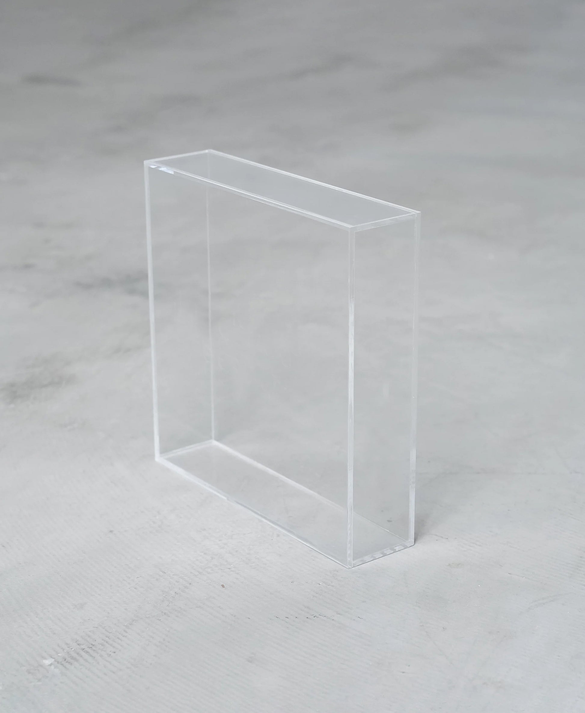 透明のアクリルで制作したボックス型サイン。本来、目立たせるはずの看板を逆転の発想で目立たせない設計をした看板です。透明の両面テープを使用して壁に貼り付けたり、カウンターの上に置いたりとアイデア次第で様々なシーンでご活用いただけます。